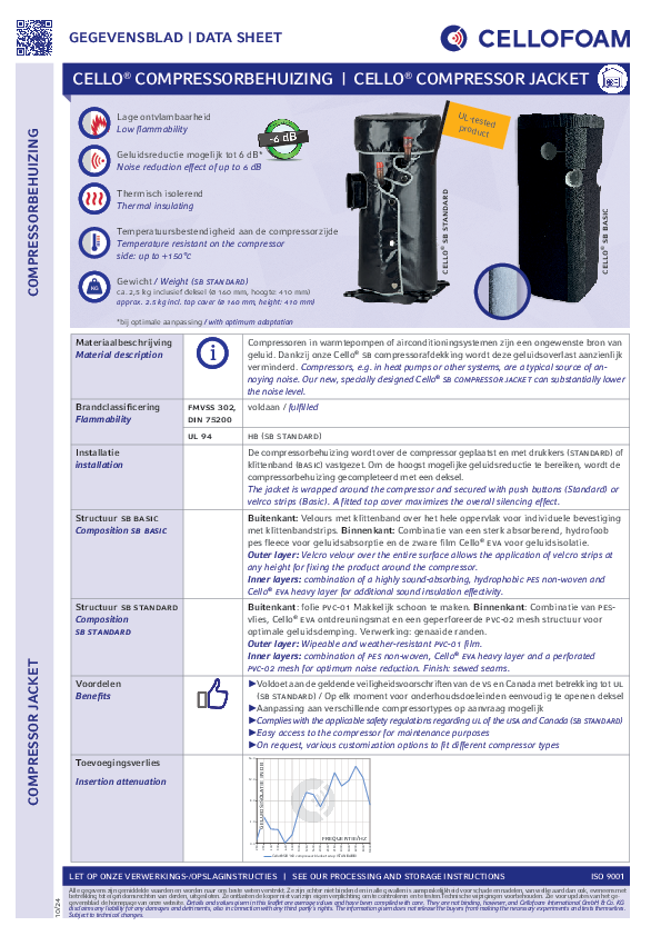 Compressoren, zoals ze bijv. gebruikt worden in warmtepompen of airconditioningsystemen, vormen en ongewenste geluidsbronnen. Dankzij onze Cello® SB compressorbehuizing wordt deze geluidsoverlast aanzienlijk verminderd. Cello® sb bestaat uit een combinatie van, enerzijds, een sterk absorberende, hydrofoob afgewerkt polyester vlies, voor geluidsabsorptie, en anderzijds een zware folie voor geluidsisolatie. Verkrijgbaar in twee varianten: Cello® SB Basic en Cello® SB Standard