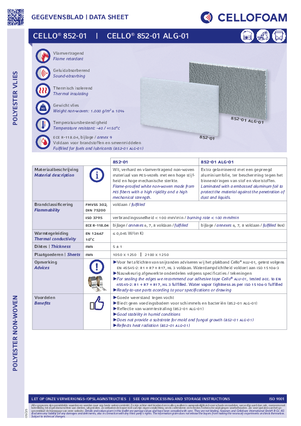 Witte, verharde en vlamvertragende vliesstof van polyestervezels. Cello® 852-01 kenmerkt zich door een enorme stijfheid en mechanische sterkte, alsook een hoge temperatuurbestendigheid.
