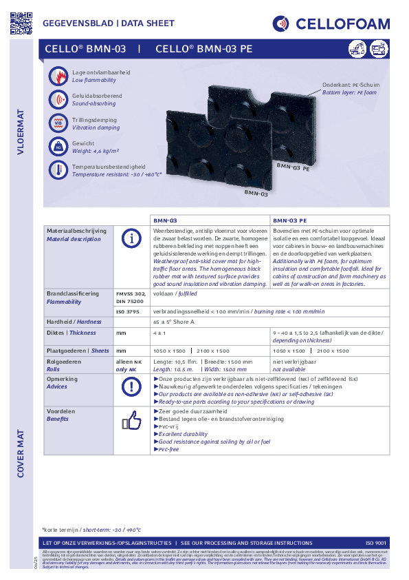 Weerbestendige vloermat voor zwaar belaste vloeren. Cello® BMN-03 kenmerkt zich door antislip-noppen en bestendigheid tegen olie- en brandstofverontreiniging.