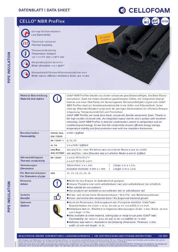 Cello® NBR ProFlex bestaat uit een zwart, geslotencellig, flexibel elastomeerschuim. Dankzij het hoge aantal gesloten cellen, de geïntegreerde dampremmende laag en een oppervlak met een uitstekende emissiviteit is Cello® NBR ProFlex ideaal voor condensatiebeheersing in de koel- en airconditioningtechnologie. De lage thermische geleidbaarheid zorgt voor efficiënte energiebesparing, temperatuurstabiliteit en vorstbescherming, zelfs bij geringe isolatiediktes.Productdetails