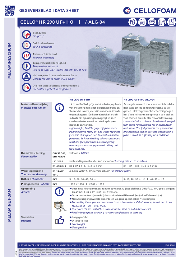 Licht en flexibel grijs zacht schuim op basis van melaminehars, voor geluidsabsorptie en thermische isolatie, met olie- en waterafstotende eigenschappen. De hoge elasticiteit maakt individuele oplossingen mogelijk in zeer krappe ruimtes, alsook voor sterk gebogen plafonds en wanden. Cello® HR 290 U + HO ALG-04 is bovendien gelamineerd met een aluminiumfolie, voorzien van gaaswerk, om de scheurweerstand te vergroten.